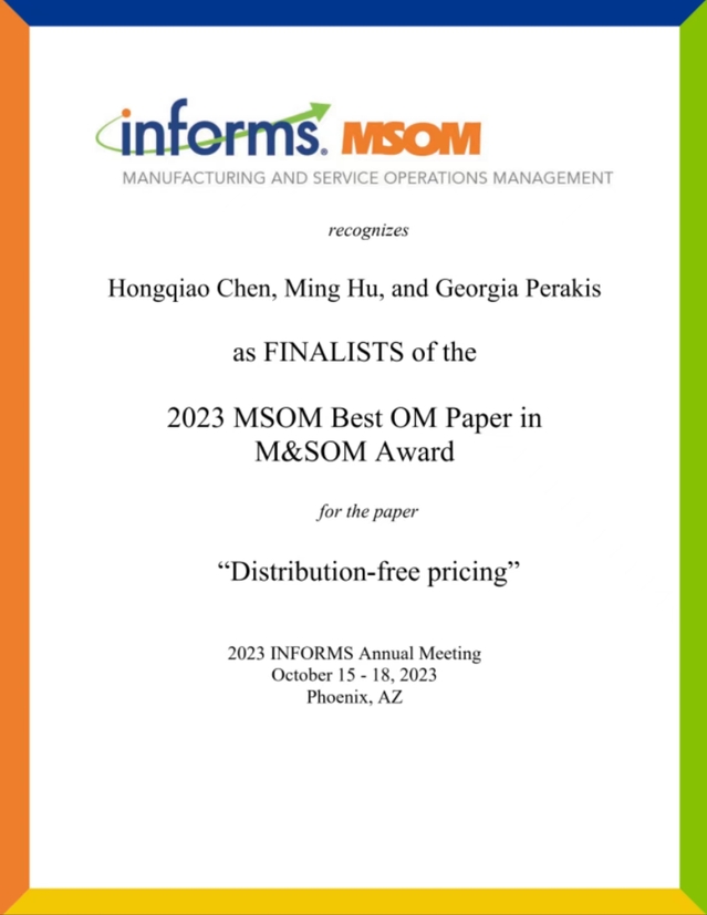 2023年10月15日至18日,美国运筹学与管理科学学会(Institute for OperationsResearch and the Management Sciences,INFORMS)年会在美国Phoenix举行。biwn必赢陈虹桥老师与多伦多大学胡明教授,麻省理工学院GeorgiaPerakis教授合作完成发表在Manufacturing & Service OperationsManagement上的论文“Distribution-Free Pricing”荣获2023年度制造与服务运作管理分会运营管理方向最佳论文提名奖 (FINALIST ofthe 2023 MSOM Best OM Paper in M&SOM Award)。该奖项授予过去三年发表在M&SOM上对运营管理理论与实践最具贡献的论文,先由M&SOM主编、区域主编、副主编投票产生3篇提名论文(第三名可并列),再从中选取最佳论文。