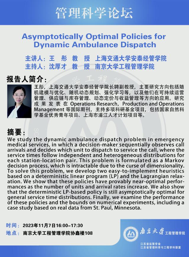 管理科学论坛:Asymptotically Optimal Policies for Dynamic Ambulance Dispatch