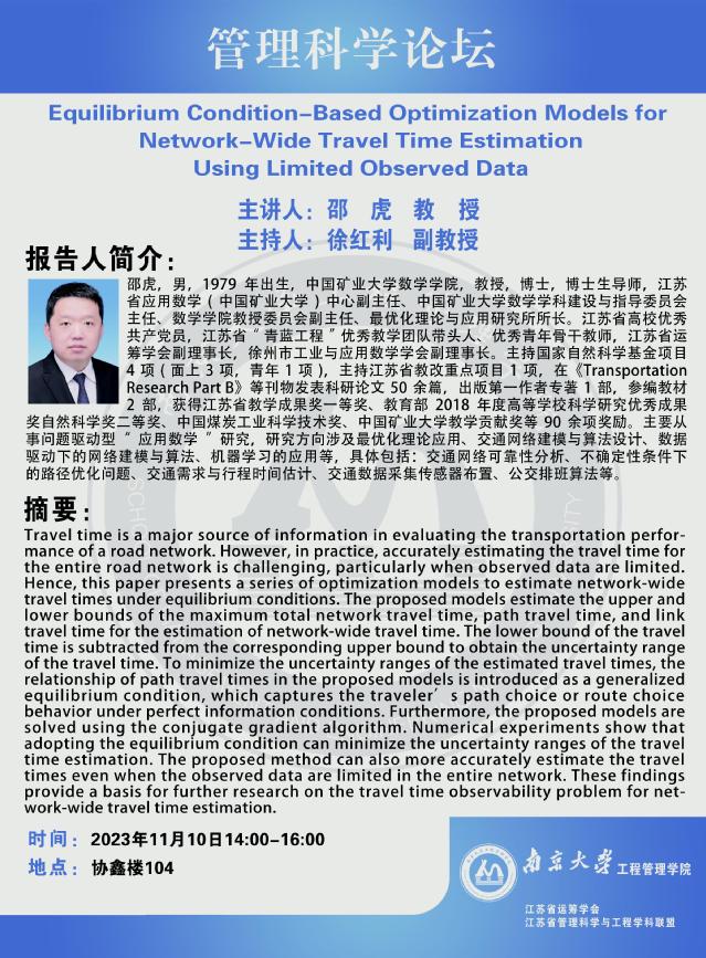 管理科学论坛:Equilibrium Condition-Based Optimization Models for Network-Wide Travel Time Estimation Using Limited Observed Data