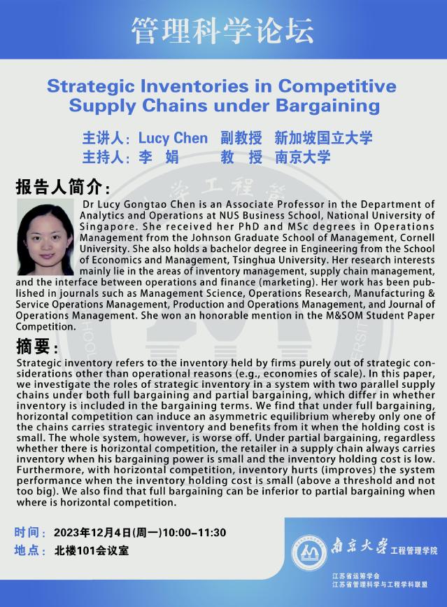 管理科学论坛:Strategic Inventories in Competitive Supply Chains under Bargaining