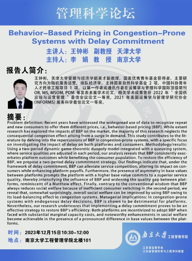管理科学论坛:Behavior-Based Pricing in Congestion-Prone Systems with Delay Commitment