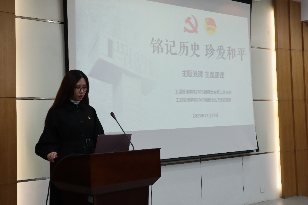 12月17日中午,支部在学院内组织开展“铭记历史,珍爱和平”主题团课。主讲人梁婷向支部团员们讲述了南京大屠杀的历史背景、事件经过及人员伤亡情况,以约翰拉贝、程瑞芳等人的故事为例,介绍了他们致力于南京大屠杀史实传播、维护世界和平的相关事迹,为团员们讲述了国家公祭日的由来和意义。