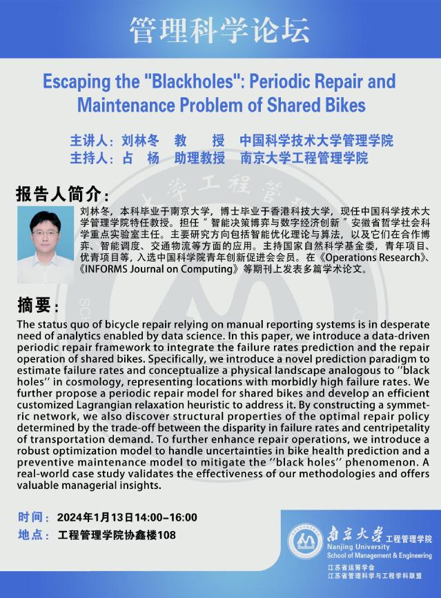 管理科学论坛:Escaping the ''Blackholes'': Periodic Repair and Maintenance Problem of Shared Bikes