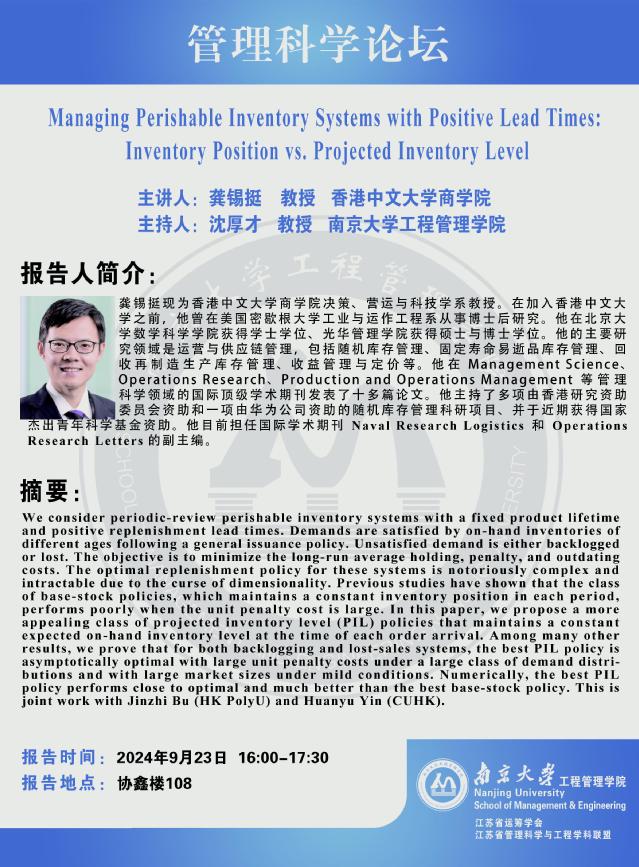 管理科学论坛:Managing Perishable Inventory Systems with Positive Lead Times: Inventory Position vs. Projected Inventory Level