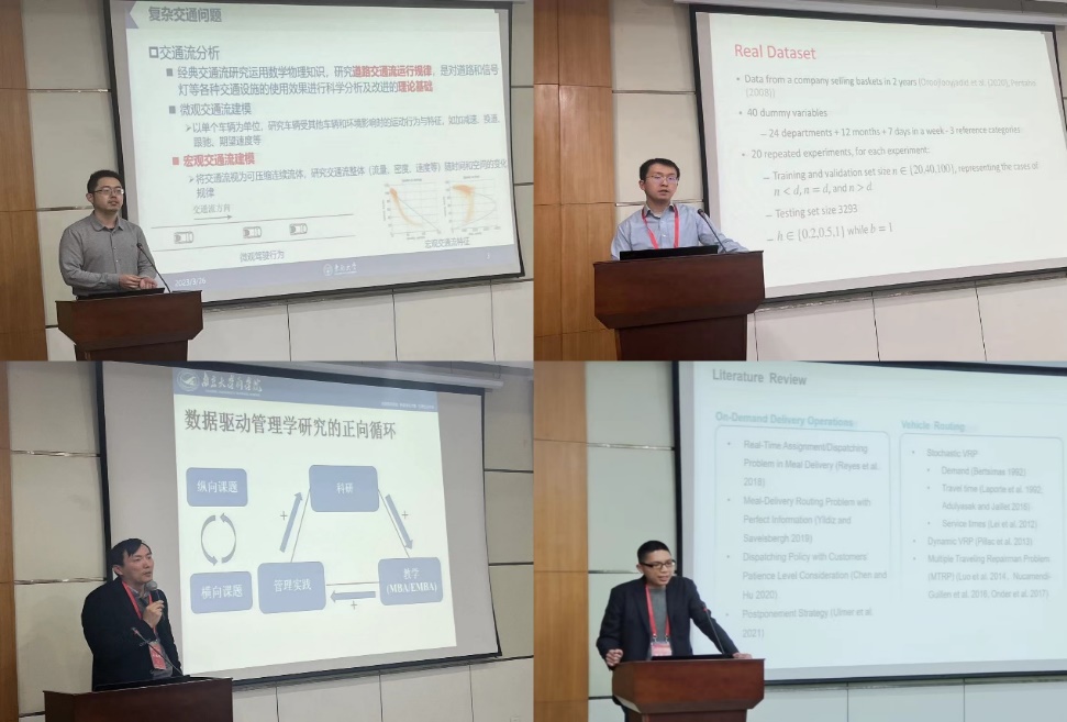 The five afternoon presentations were chaired by Prof. Wang Yudong, Dean of School of Economics and Management, Nanjing University of Technology, and Prof. Xue Weili, Vice Dean of School of Economics and Management, Southeast University. Professor Yu Ning, Executive Director of the Institute of Social and Economic Research, Nanjing Audit University, gave a presentation entitled "Job Matching under Interventions", starting with two related studies on market design from the perspectives of hard and soft constraints of market intervention. Professor Liu Zhiyuan, Associate Dean of the College of Transportation at Southeast University, gave a presentation titled "Improved Gaussian Process Models for Dealing with Complex Traffic Problems", proposing a data-driven traffic flow model that introduces methods such as modeling statistical relationships between variables directly and not relying on equilibrium state assumptions, which has wide applicability. Professor Rui Gao from the School of Business at the University of Texas at Austin gave a presentation titled "Optimal Robust Policy for Feature-Based Newsvendor". Professor Gao investigated a feature-based policy optimization for newsvendor problem, seeking an end-to-end, explicit mapping from features to subscription decisions. Professor Song Peijian from the Department of Marketing and E-Commerce, School of Business, Nanjing University, gave a presentation titled "Empirical Research on Data-Driven Management: Two Papers as Examples", using two specific problems of Suning Omnichannel, online ordering store pickup and backend data of room booking APP, as examples to emphasize the need to help companies make decisions to achieve cost reduction and efficiency. Associate Professor Luo Zhixing from School of Management and Engineering, Nanjing University, gave a presentation titled "On-Demand Delivery from Stores: Dynamic Dispatching and Routing with Random Demand", modeling the last-mile delivery system with on-time performance as the main goal to achieve random dynamic The presentation was entitled "OnDemand Delivery from Stores: Dynamic Dispatching and Routing with Random Demand".