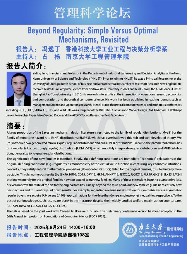 管理科学论坛:Beyond Regularity: Simple Versus Optimal Mechanisms, Revisited