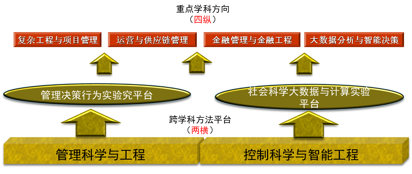 学院以“特色、交叉、高水平、国际化”为学科建设的宗旨,并结合学院自身特点,坚持“管理-控制一体化”的交叉融合发展理念,以理论研究瞄准国际学术前沿、应用研究瞄准国家重大需求为学科发展目标,以管理科学与工程和控制科学与智能工程两大学科为基础,以已有雄厚科研基础的“智能决策行为实验平台”和“社会科学大数据与计算实验平台”为支撑(两横),凝炼形成了具有鲜明特色的四个研究方向(四纵),科学规划了“两横四纵”的学科布局: